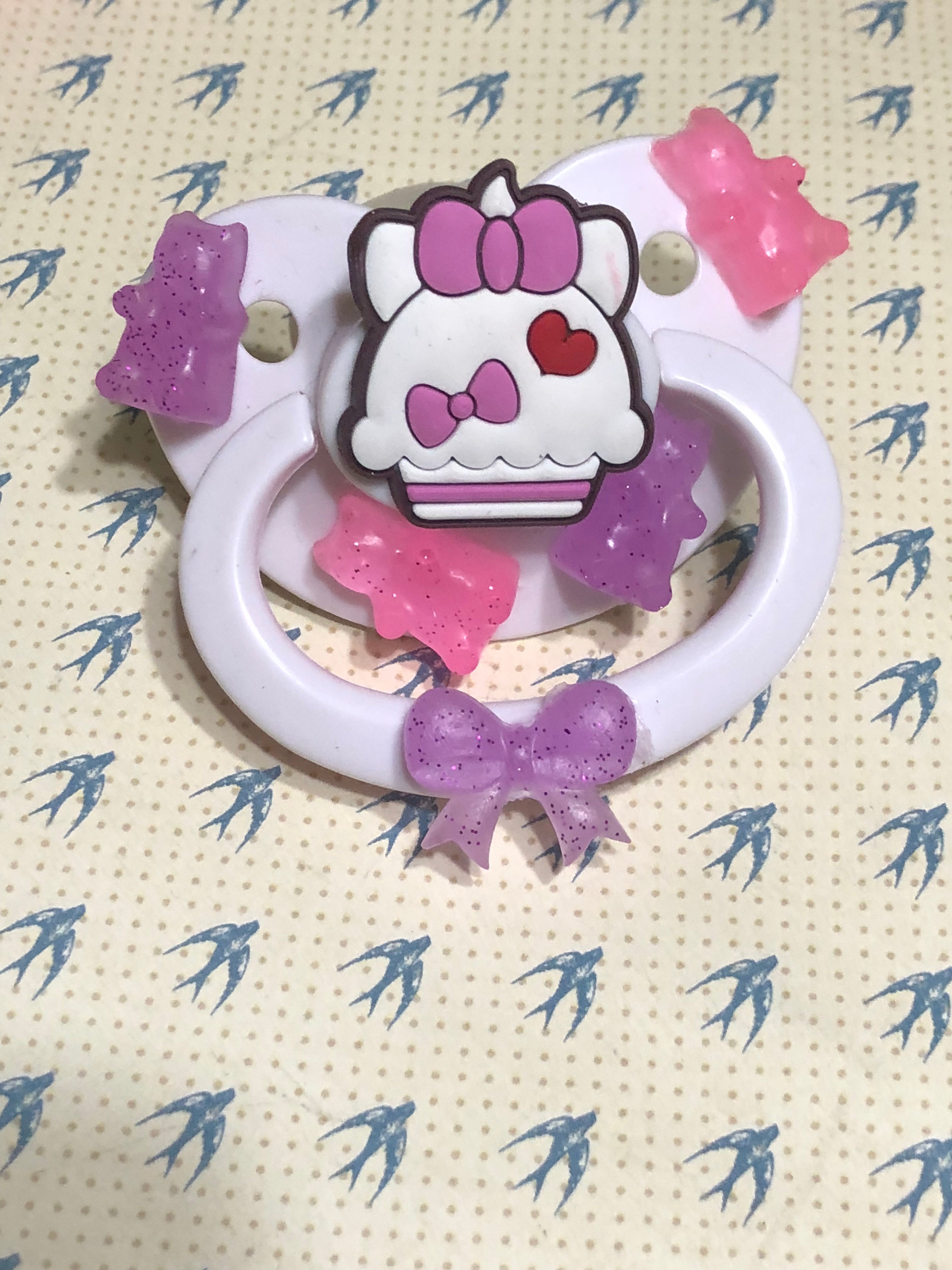 Ddlg/Abdl White “Gummy bears and Cupcake” Adult pacifier (Glows in the dark !)