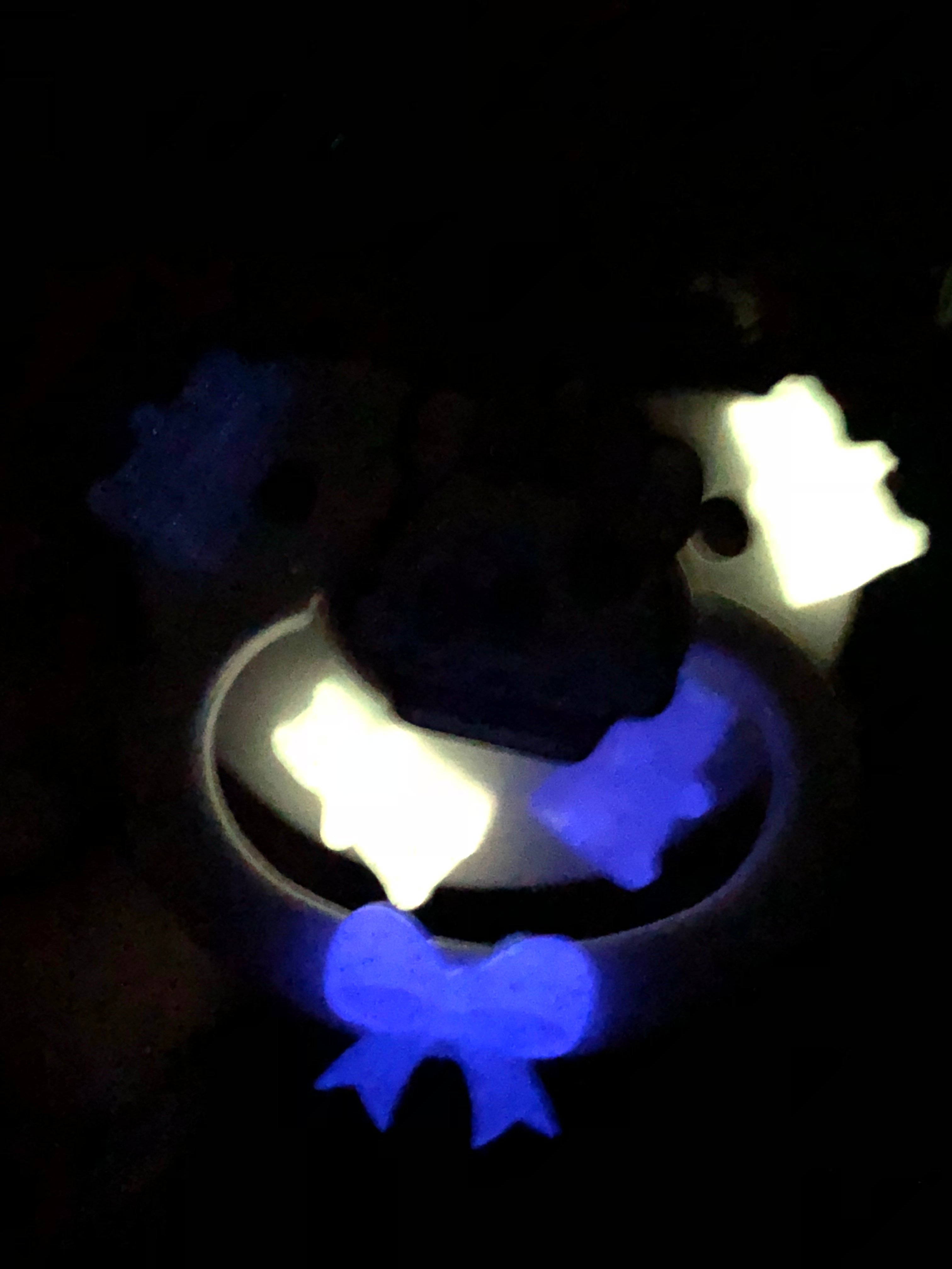 Ever wanted a paci that’s cute even in the dark?!? Well look no further, this one of a kind paci is made with glow in the dark component to make the front and hearts on the sides and front light up in darkness. (After being exposed to light of course)